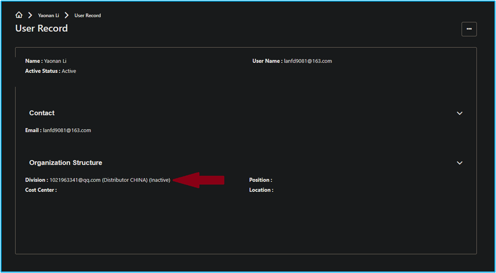 Should a user not be able to confirm their employee type and you do not see Distributor under the 'Identifier' section, you can find this information by clicking on the user's name. This will take you to the following screen where under 'Division' you can see that they are indeed a Distributor.