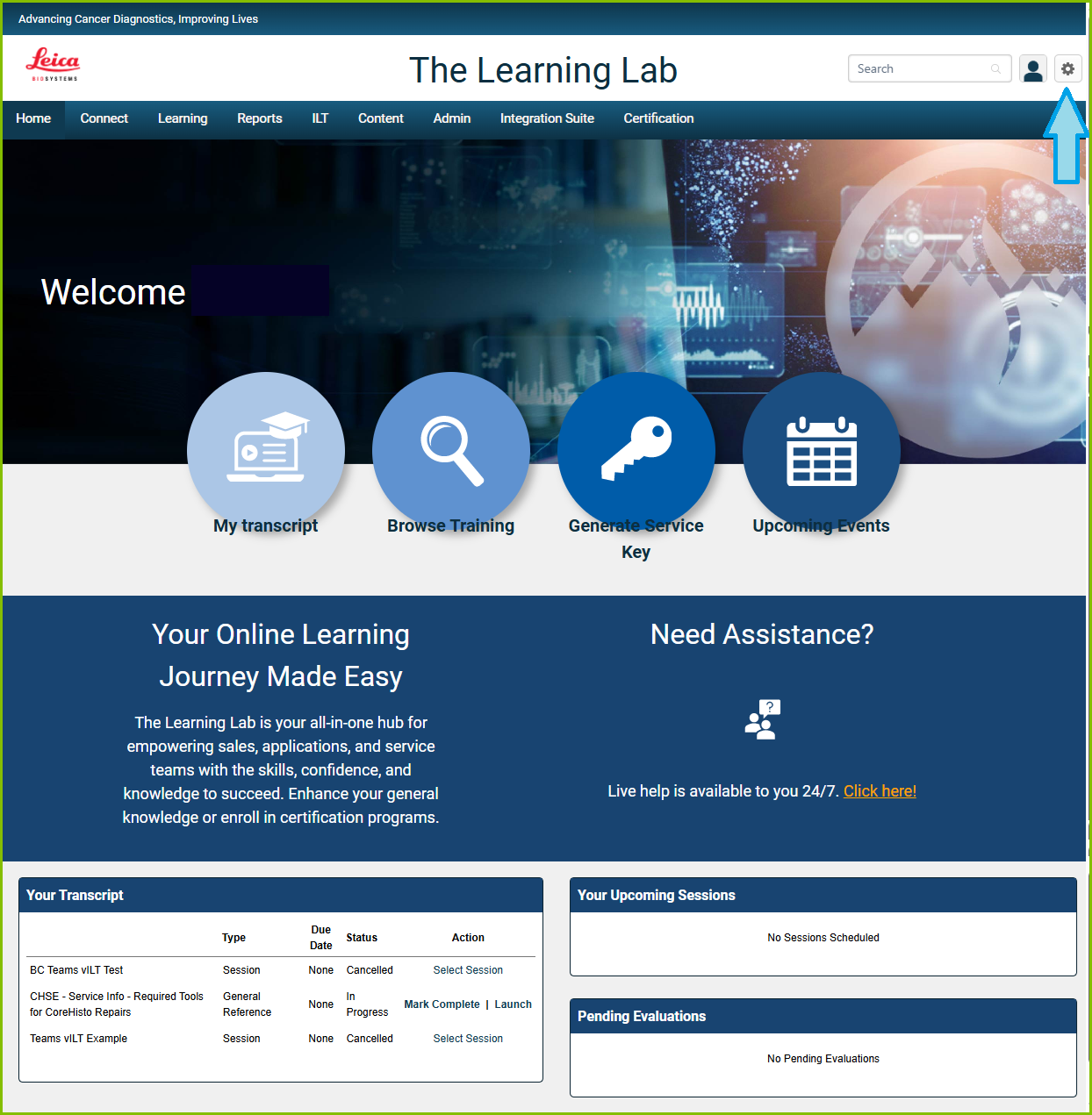 1. Select the gear icon in the upper right corner of The Learning Lab landing page.